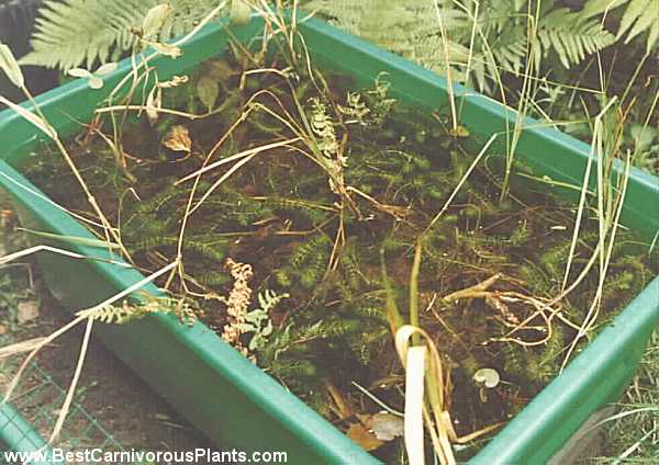 The best place to grow Aldrovanda is outdoors in an earthenware or plastic container. I grow my plants in a round plastic lily pond 1 metre in diameter and 35 cm deep. It is important to use a relatively shallow container with a large surface area. The smaller the volume of your container, the more difficult it will be to create and maintain stable conditions. The tank can be protected from curious birds with a net. There are a few records of cultivation indoors (Ashida, 1934; Ohtaki & Katagiri, 1974), but I doubt that the plant can be grown that way for prolonged periods.